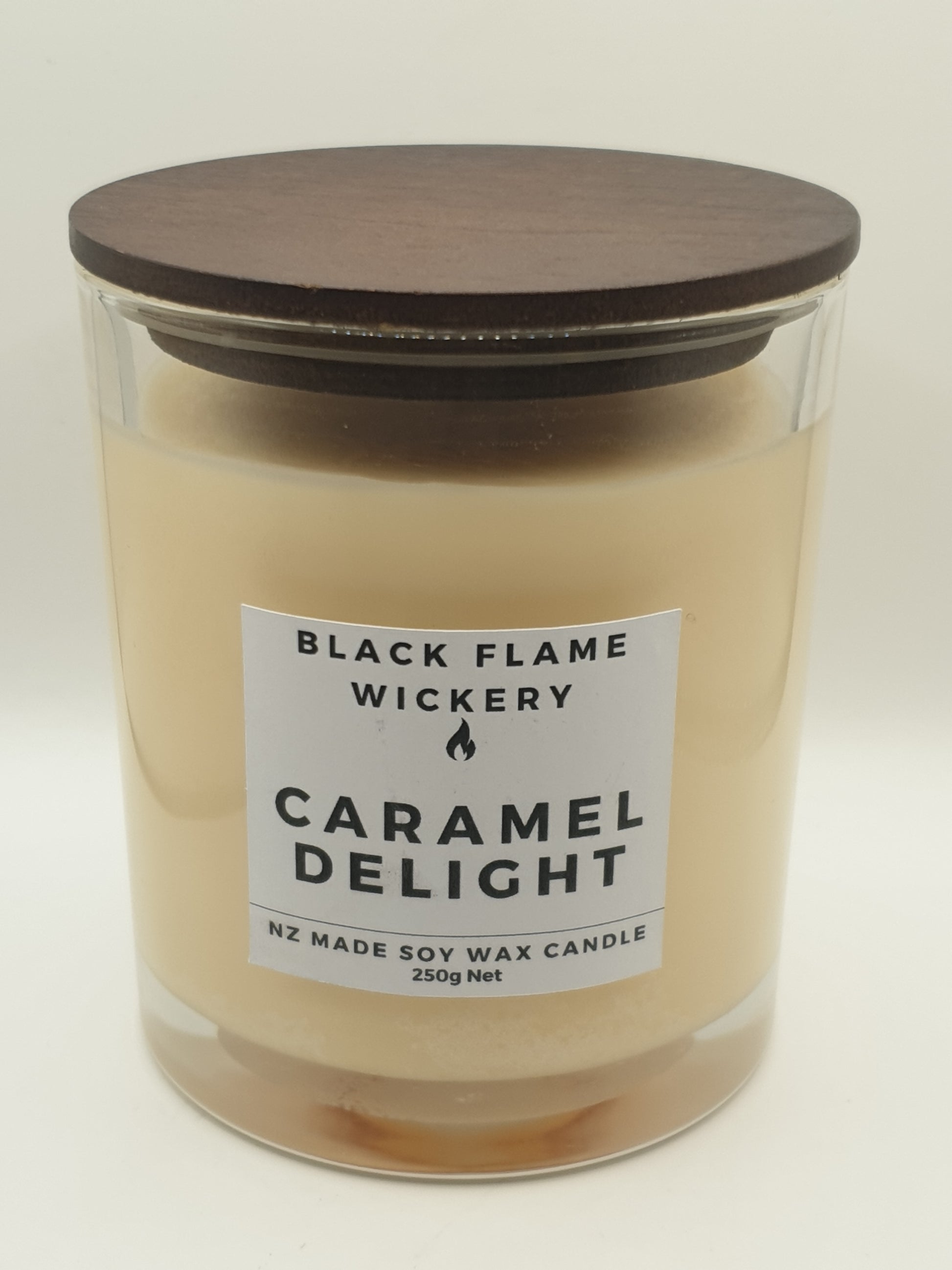 High quality clear glass container with a dark walnut wood lid, available in an assortment of delicious fragrances to choose from.